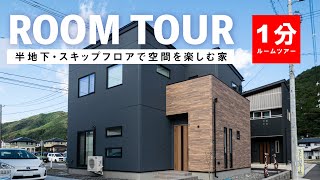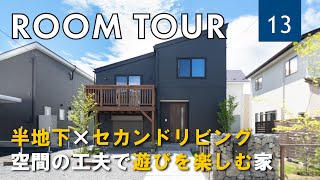 空間を生かしたスキップフロアの遊びゴコロを忘れない自由な大人のための家。半地下の趣味部屋、梁や柱・アクセントクロスがかっこいいLDKとセカンドリビング+個室2部屋と外部収納のコンパクトながら暮らしを楽しめる間取り。